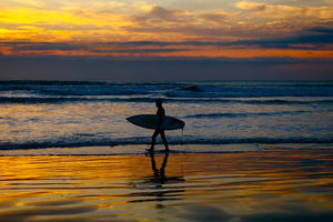 朝焼けの中を歩くサーファーの写真です。商用等、ご自由にお使いください。